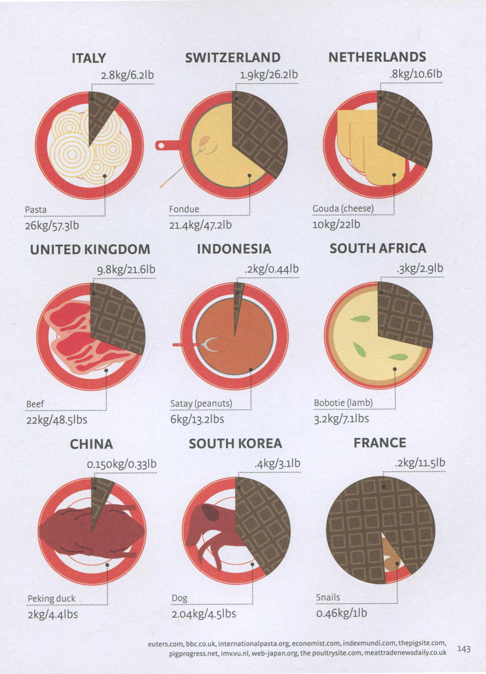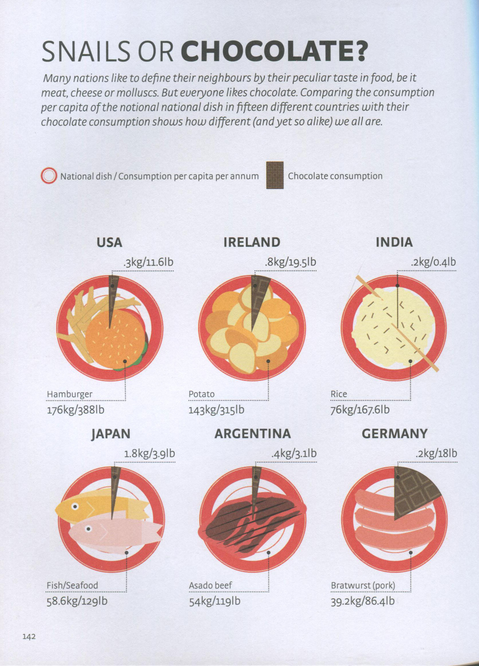 As an example, here’s a food graphic. Every country has a dominant or favorite food. And in every country people eat chocolate. So, what’s the ratio between that favorite food compared to chocolate?