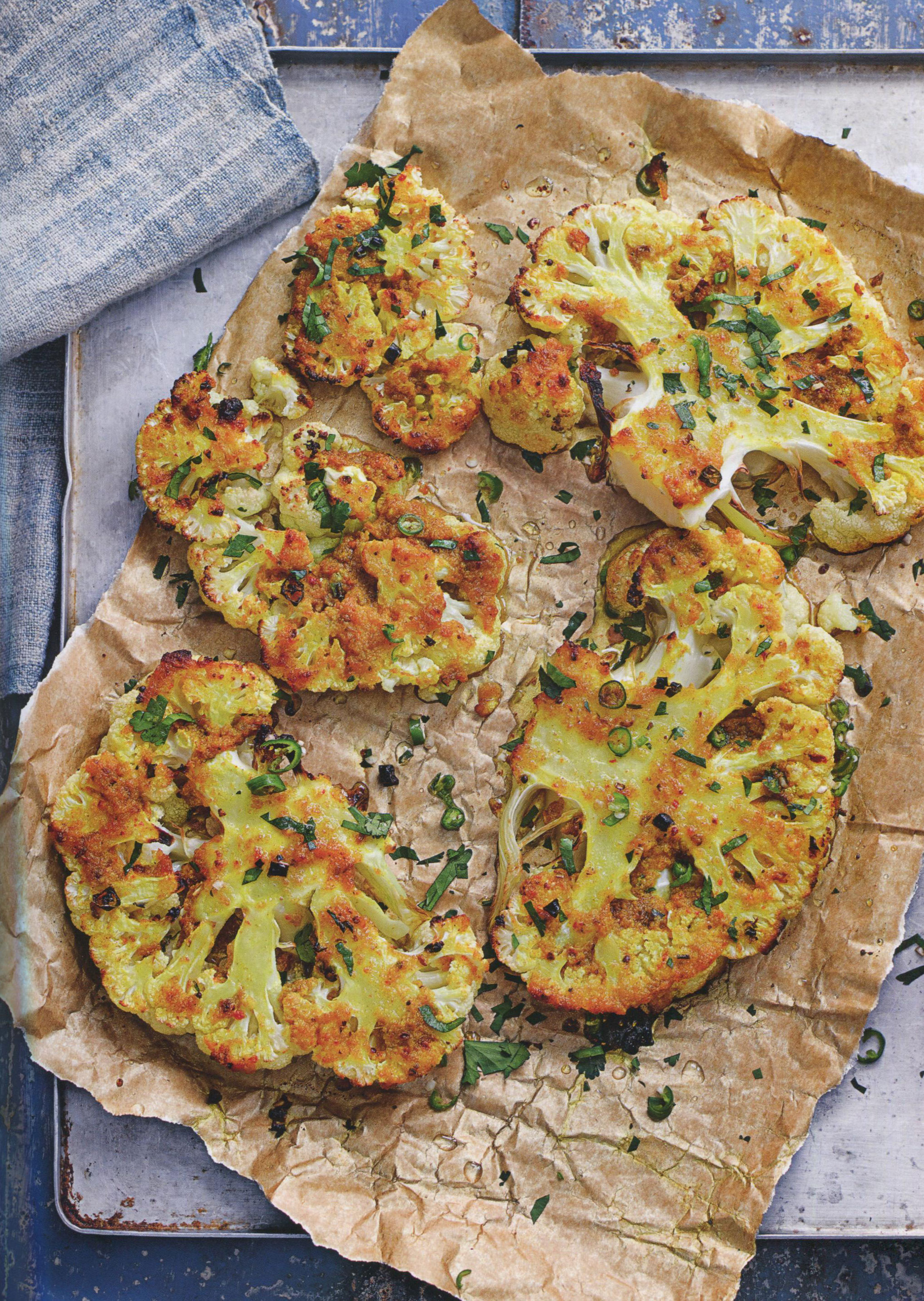 This post ends with a picture of steak. Not beef — this is, my goodness, an Indian cookbook. No, this is the Grilled Spiced Cauliflower Steak, a dish offering equal satisfaction.