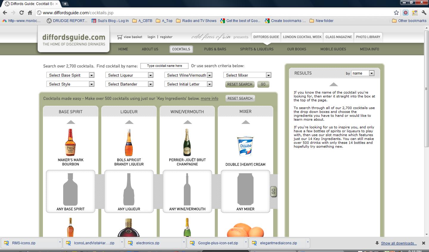 So, once again, I turned to www.giffordsguide.com, the most fabulous site and resource for home bartenders on the planet. The picture at the top is a screen shot of the cocktail page. It’s sitting there ready for you to make selections, say for the base liquor, and the application will come up with one or more recommendations [okay, you can specify so many things that there are no recommendations; in which case, try again!].