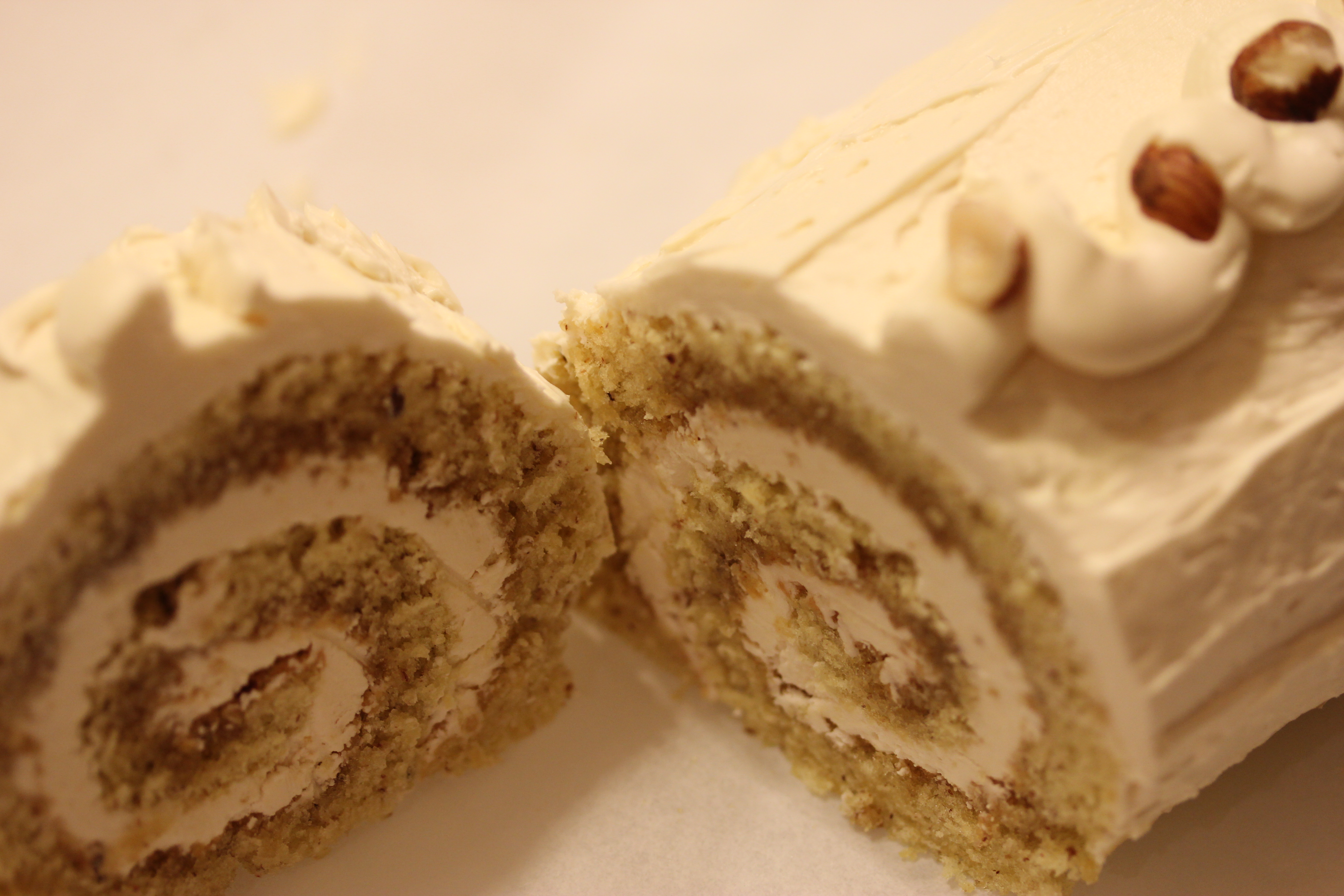 Spread the layer with half the buttercream. Use the paper to help you roll the cake into a tight cylinder. Transfer to baking sheet and refrigerate. Reserve the remaining buttercream for the outside of the Buche.
