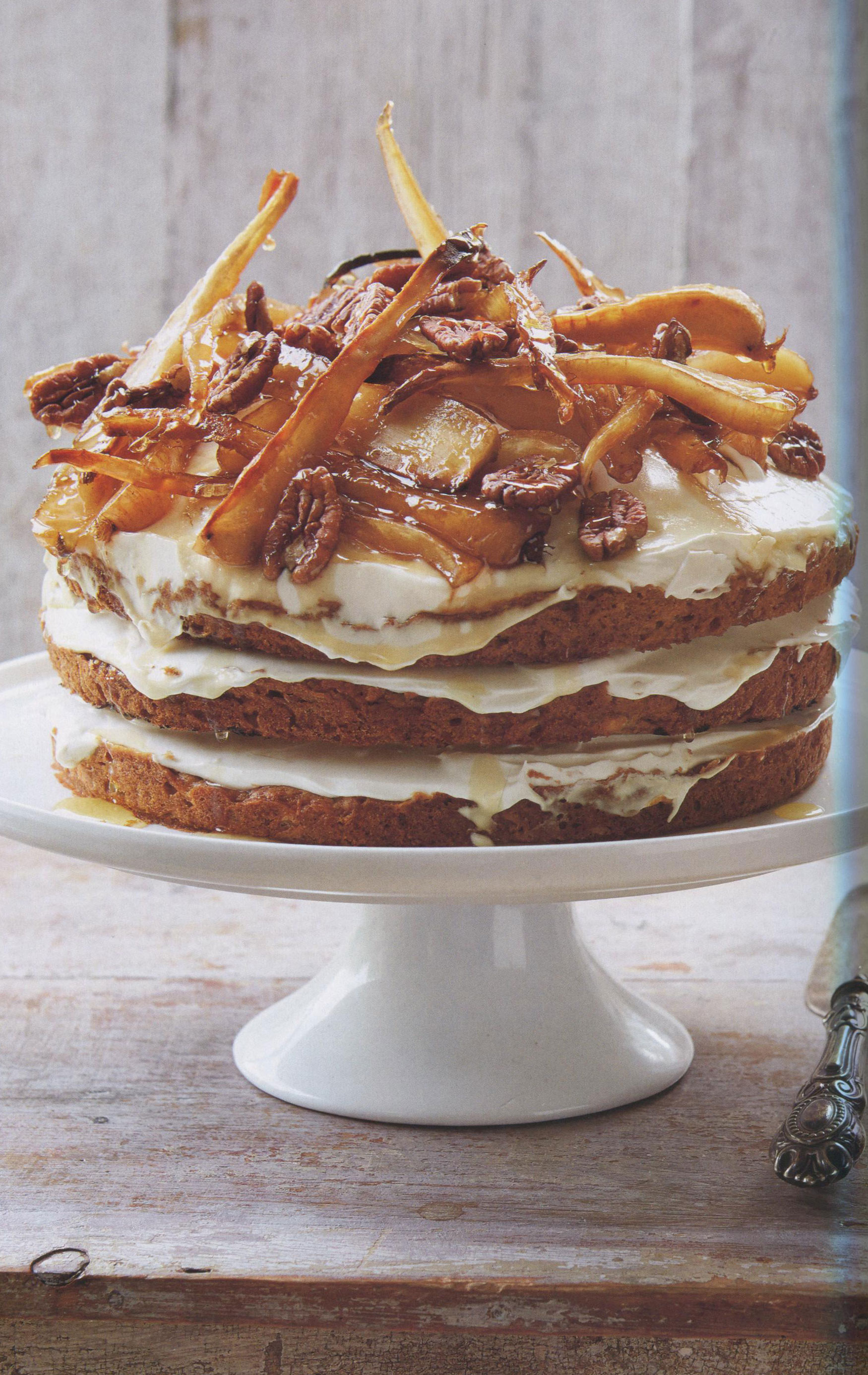 Just before serving, mix together the mascarpone and maple syrup. Spread one-third of this mixture onto one of the cakes and place another cake on top. Repeat to make another layer, then spread the remaining mascarpone onto the top layer. Pile the candied parsnips on top and scatter with the whole pecans. Drizzle with some of the remaining sugar syrup and serve.