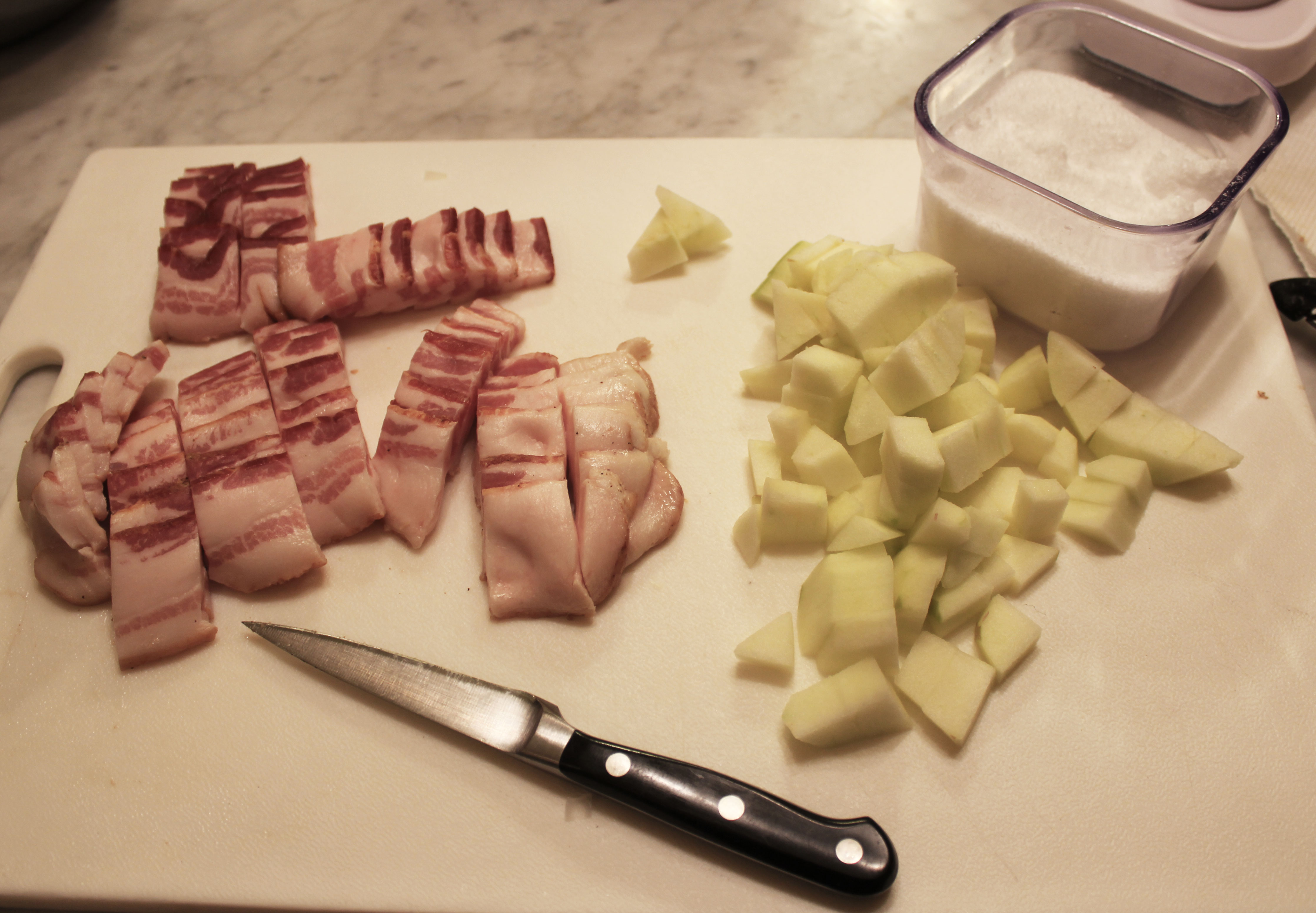 Cut the bacon in strips 1 inch long. Place in a frying pan and cook over medium heat until cooked but not crisp.