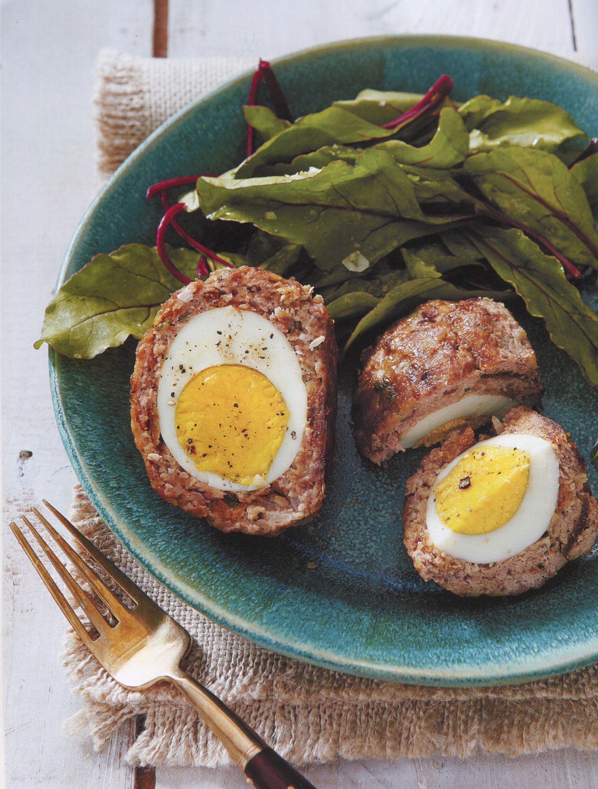 Divide this meat mixture into six equal portions. Cup a portion in your palms, flatten and form the meat mixture to make a concave depression at its center; set a hard-boiled egg in this, then wrap and form the meat mixture into a ball around the egg, sealing it well on all sides with no gaps. Set on the baking sheet and repeat with the remainder of the meat mixture and eggs.