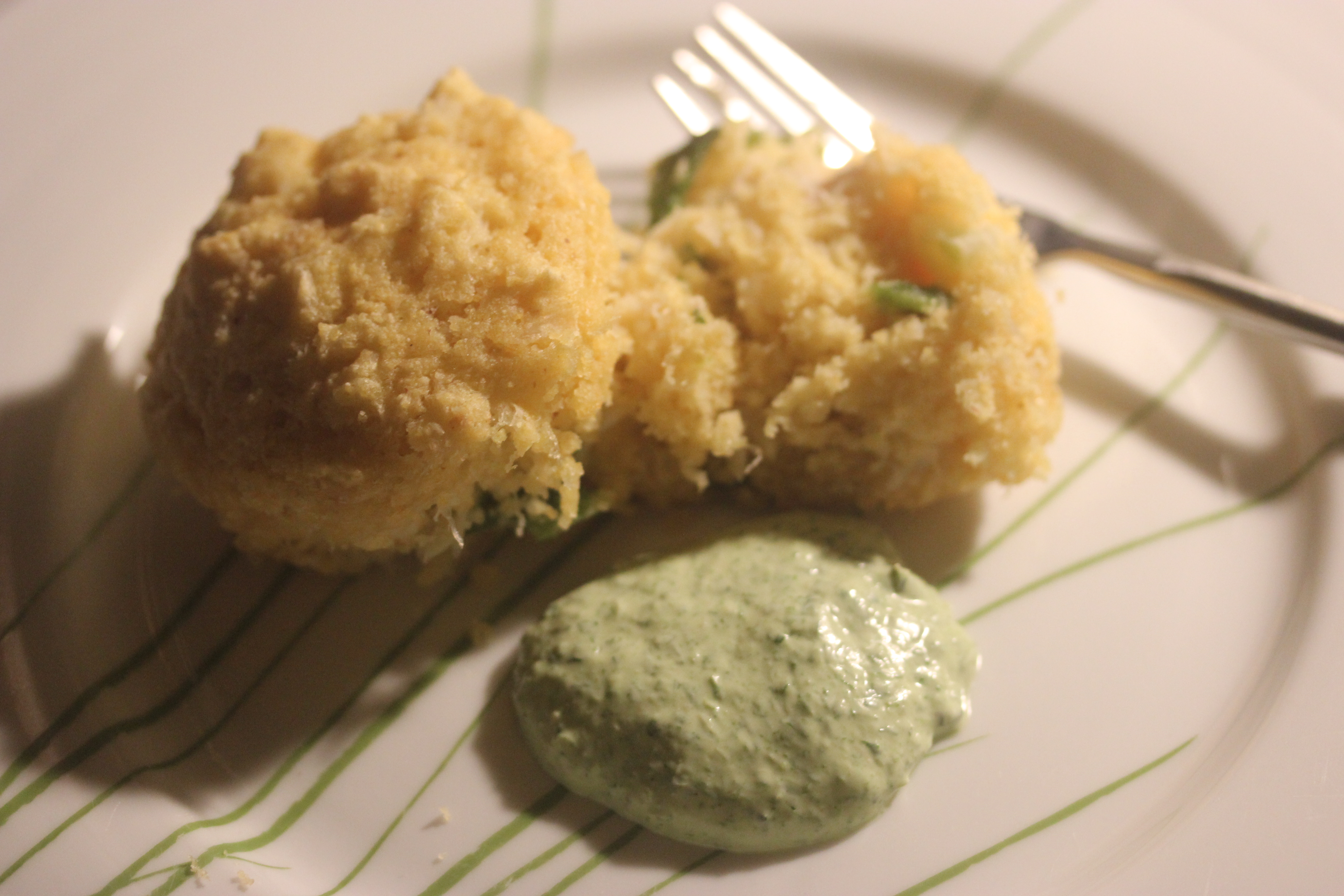 So for the rest of the batter, I used mini-cupcake tins which worked just fine. [And that explains the picture above!] The flavor of poblano and crab does not depend on the shape or size. It’s all in the mixture.