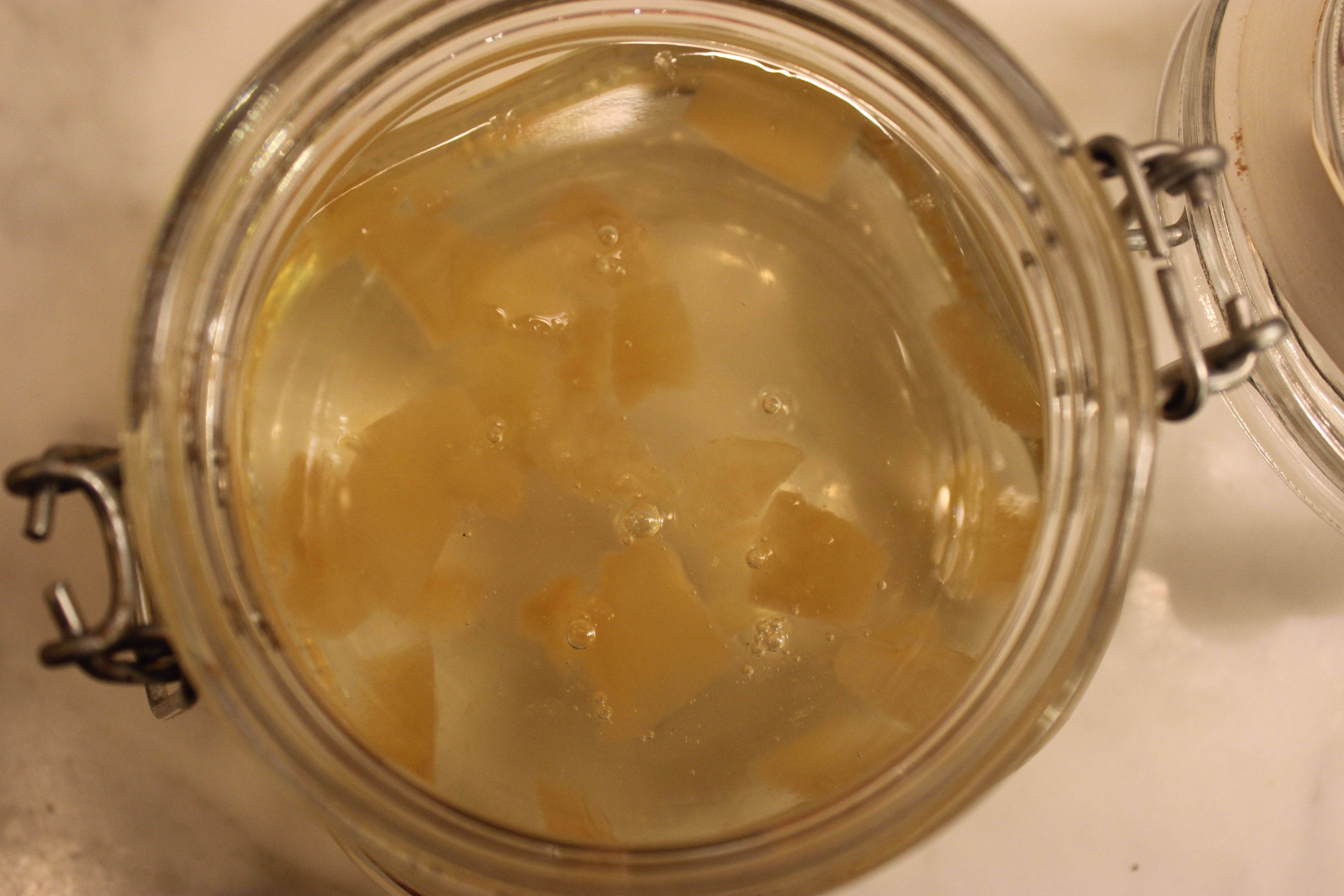 Put the water and ice in a small sauce pan and stir to mix. Turn the heat to medium and, stirring occasionally, bring to a boil. Reduce the heat to simmer and add the ginger pieces.